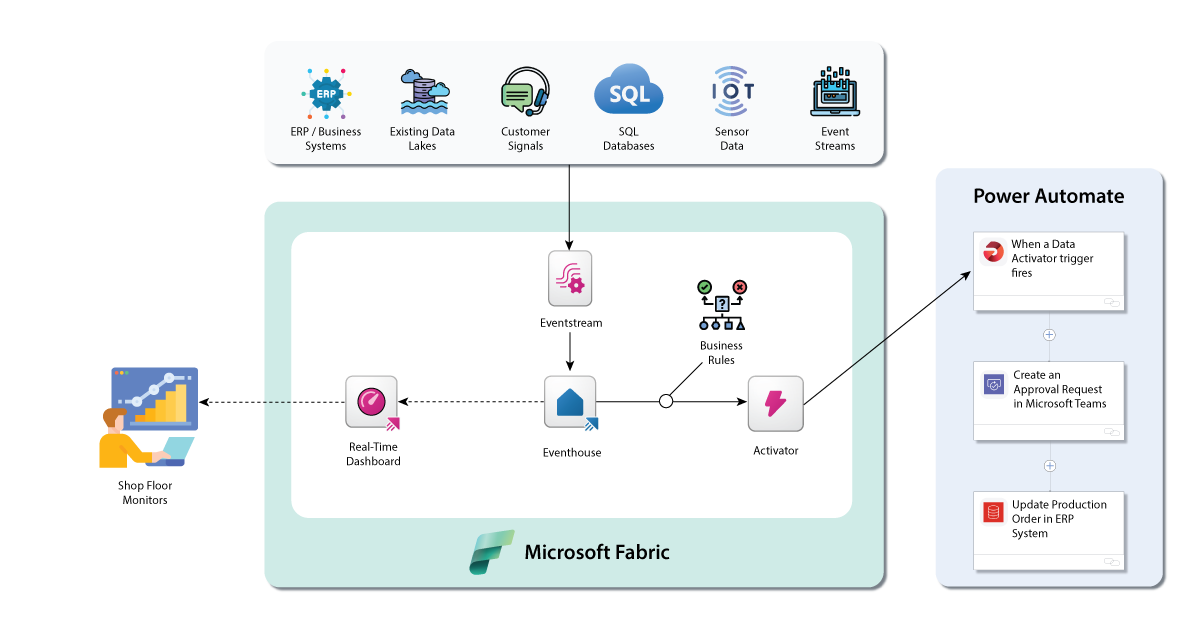 With Fabric Real-Time Intelligence, we can do that very thing by keeping a constant finger on the pulse of what’s happening across the enterprise. Whether it’s a new transaction hitting your ERP, an important business event being logged, or a machine signaling a potential failure on the shop floor, Real-Time Intelligence can monitor these signals the instant they occur.