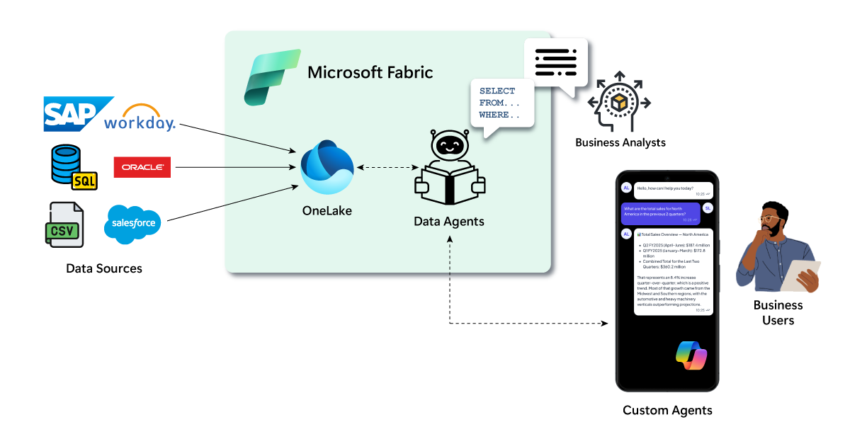 As you can see in Figure 13, while data agents naturally understand technical data models in Fabric, they can be further trained by business analysts that can coach the agent on how data is interrelated on a functional basis, how the business thinks about or interprets different data points, etc. The end result is more than just a chatbot interface to convert natural language queries into SQL — these agents can think and reason over the data to carry on highly complex conversations about the data from a non-technical business perspective.