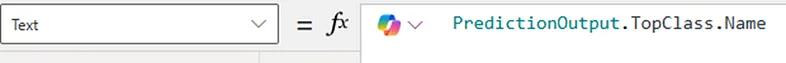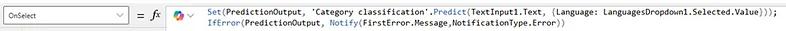 Next, click on the Button Component and enter the code below for OnSelect to access the Predict call of the Category Classification AI Function.