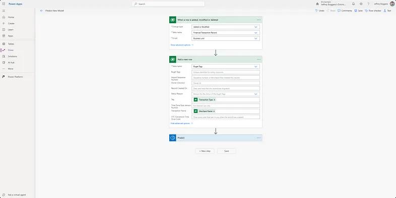 Next, we need to ensure that updates or additions to our Financial Transactions table trigger updates to our model, which is driven off the Budget Tags table. In Figure 27, you can see we have built a flow triggered by updates to the Financial Transactions table that translates those choice values into text updates to the Budget Tags table so our model may be trained on these new changes.