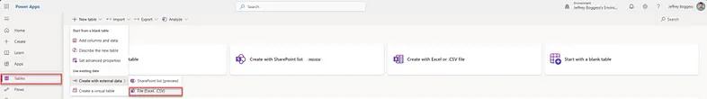 Next, navigate to the Tables blade and create a new table using external data (i.e., our CSV file).