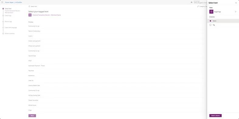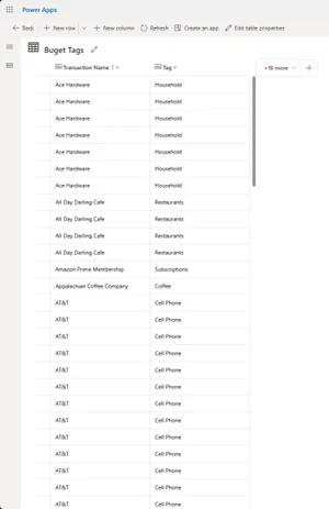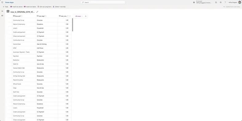 The Transaction type column highlighted in Figure 12 has already been declared as a choice value with the choices shown in the screenshot. While we want these categories to be defined as a choice for the user experience, our AI model can only interpret categories as a text type often referred to as Tags. Since we already have sample data with appropriate category tags denoted, we just need to re-upload this data in text columns with only our Transaction name and appropriate Tag as shown in Figure 13.