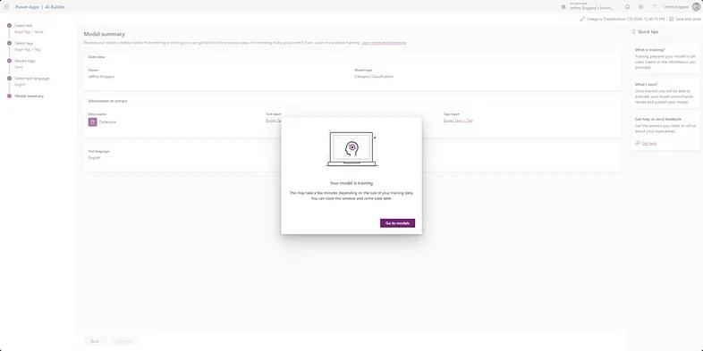 Once you press create, your model will begin training on your data as shown in Figure 19. From here, you can navigate to the resource via the “Go to models” button. This will take you to Figures 20–21, where you can perform a quick test once the model has finished training and finally publish once functionality is verified.