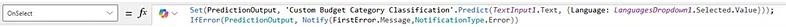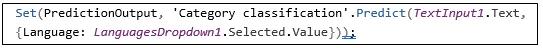 Examining this code a little closer, what we’re doing is calling the Set function which is setting a variable we just declared as PredictionOutput and using the Category Classification function Predict which takes in two values, our text input and our language dropdown selected value. Now, we need to display the results of this variable PredictionOutput.