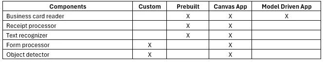 These six functions provide the above operations on which many prebuilt models have been made available to you to leverage in Power Apps and Power Automate. In other words, AI functions are specific operations you can perform while AI models are the underlying algorithms that power those functions. While all the below components can be used in Power Automate, see the table below for some example AI components and how they can be used in Power Apps.