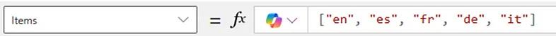 Once we’ve added the data source, let’s add the functionality to our app. Click on the dropdown component and enter the following language options under the Items dropdown menu.