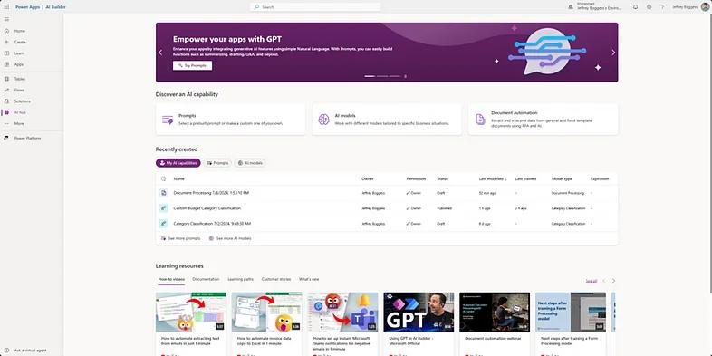 Now that we have created all our data, we can create our AI model. Located in Figure 14 below, you can see the homepage of Power Apps where the AI Hub blade is Highlighted to the left of the screen. If you do not see the AI Hub blade, then click on “More” and navigate to the AI Hub option. If you see yourself using AI Builder frequently, you may want to pin the blade to your navigation pane.