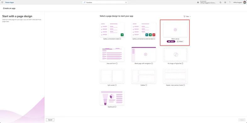From the Apps blade, select “Start with a page design” and choose “Blank canvas” as shown in Figure 2.