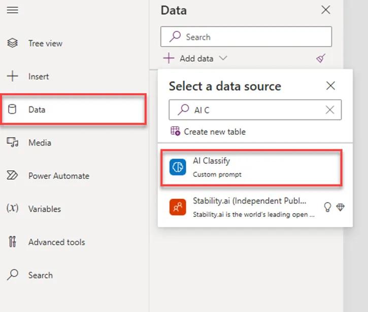 Now to add the AI function. Navigate to the Data blade on the left navigation and click add data to add the AI Function as a data source shown in Figure 4 below.