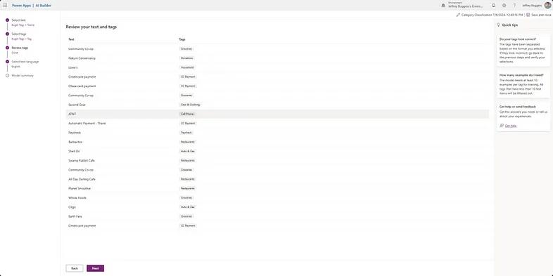 Now that our model is published, let’s revisit our Canvas app and customize it to our own purpose of categorizing financial transactions. First, we need to plug in our custom model as the data source as we did with the pre-built one in Figure 4. Then, by updating the OnSelect as shown in Figure 22, we can now use this app to categorize expenses as we can see in Figure 23.
