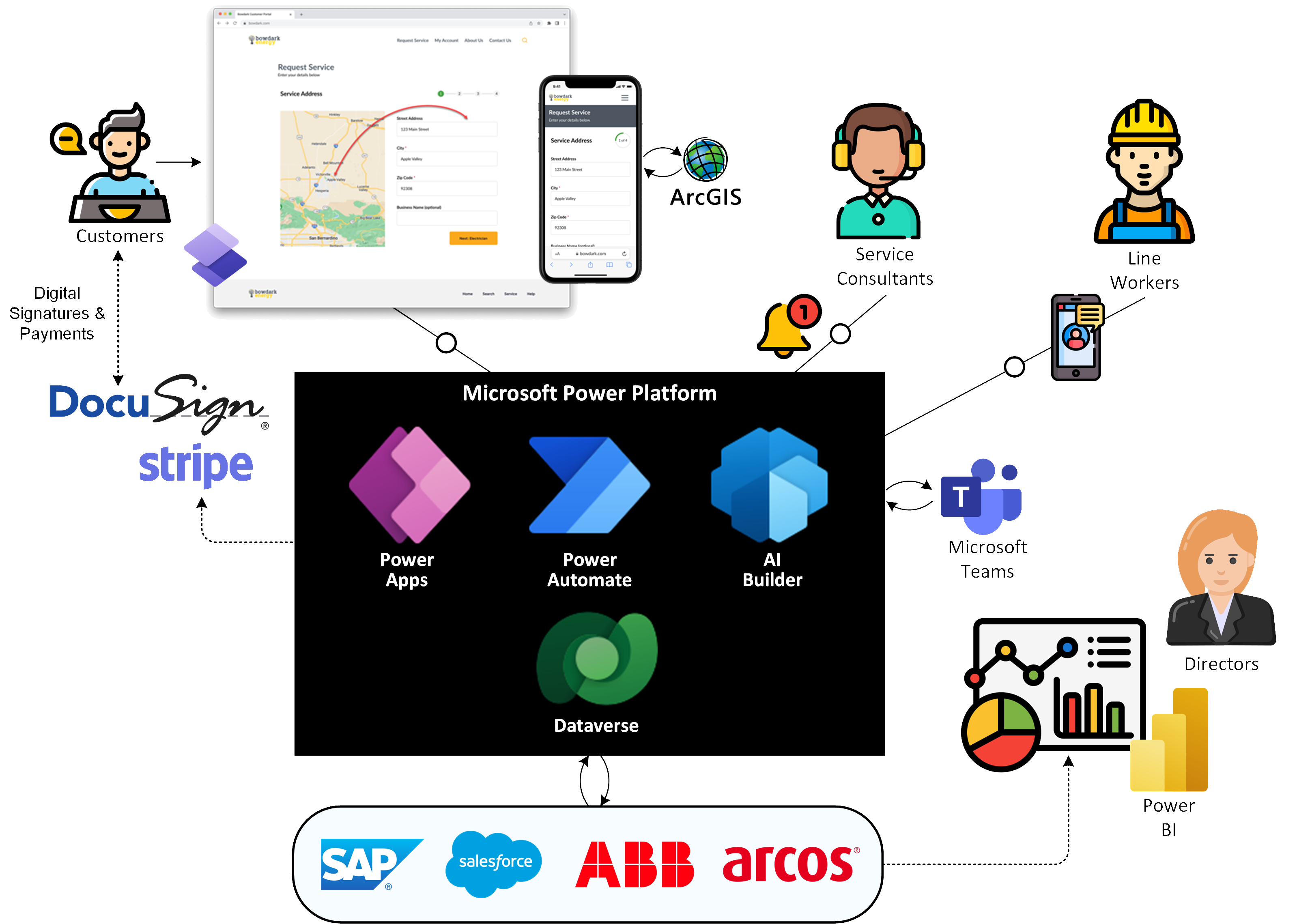 Residential and/or commercial customers enter service requests in a self-service portal (Power Pages).