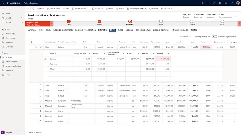 D365 Project Operations is stuffed with embedded analytical views that can be used to monitor project budgets, track resource utilization, profitability, and so forth. Figure 5 shows an example of the built-in budget tracking view within a project. These embedded views provide a single pane of glass for various user personas.