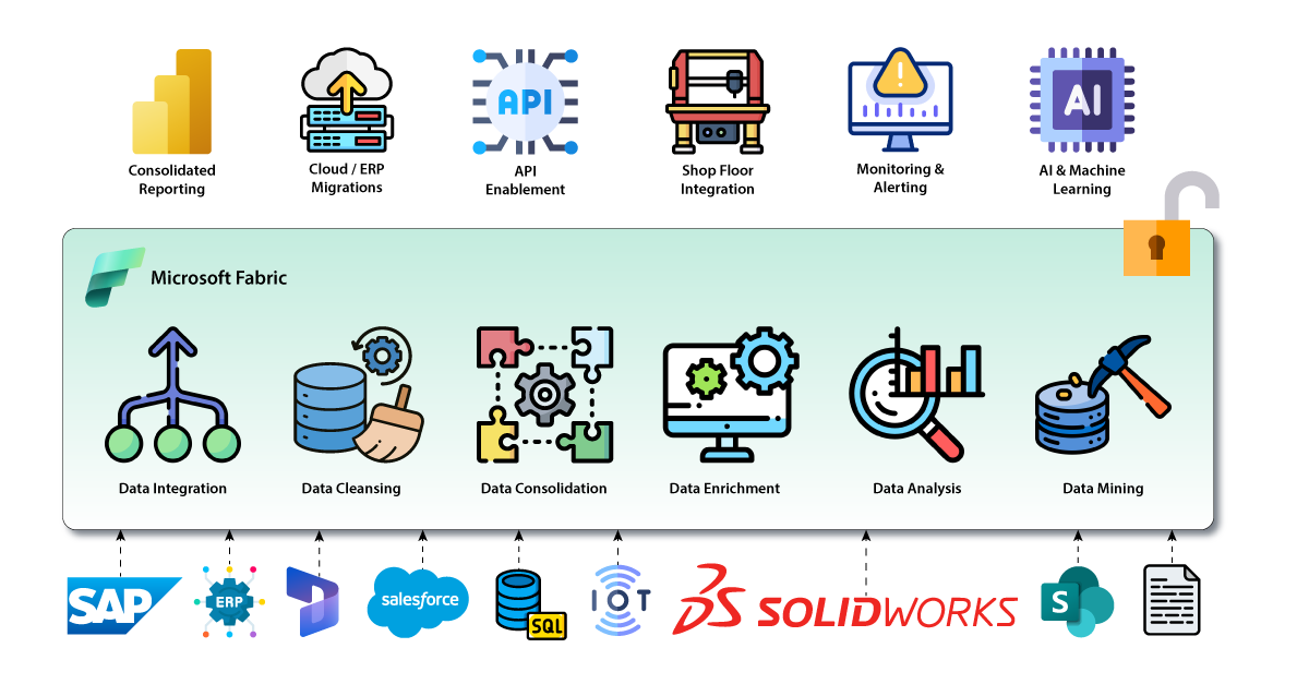 Logically, a data fabric acts as the connective tissue that allows every system, from ERP to the shop floor, to plug into the same information backbone. That unlocks four critical capabilities: