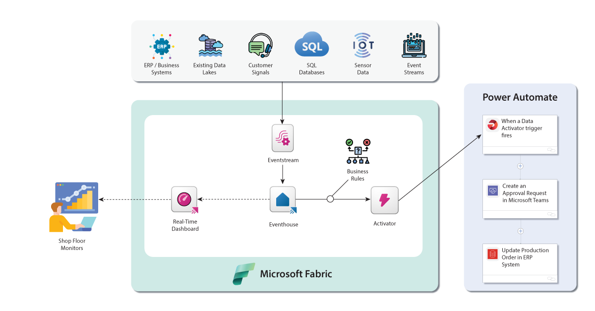 Real-Time Intelligence: With event streams flowing through the fabric, manufacturers can sense and respond in the moment — adjusting production processes, triggering maintenance, or flagging anomalies before they become bottlenecks.