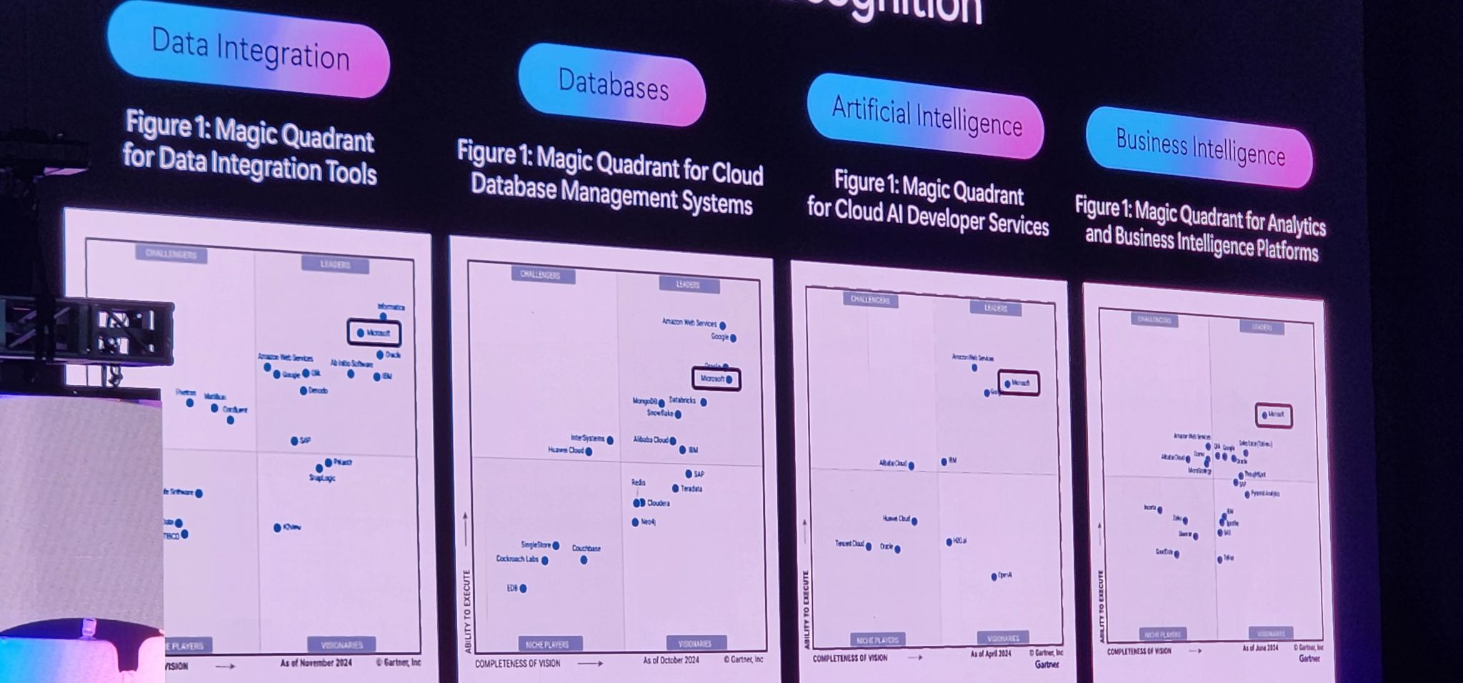 Microsoft was also proud to announce that they are literally 1-of-1 in terms of software vendors that are recognized as leaders in Gartner's key Magic Quadrants for data and AI: