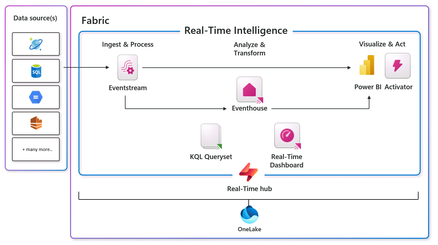 Real-Time Hub – A centralized interface for managing real-time data sources, pipelines, and insights, simplifying the monitoring and administration of streaming workloads.