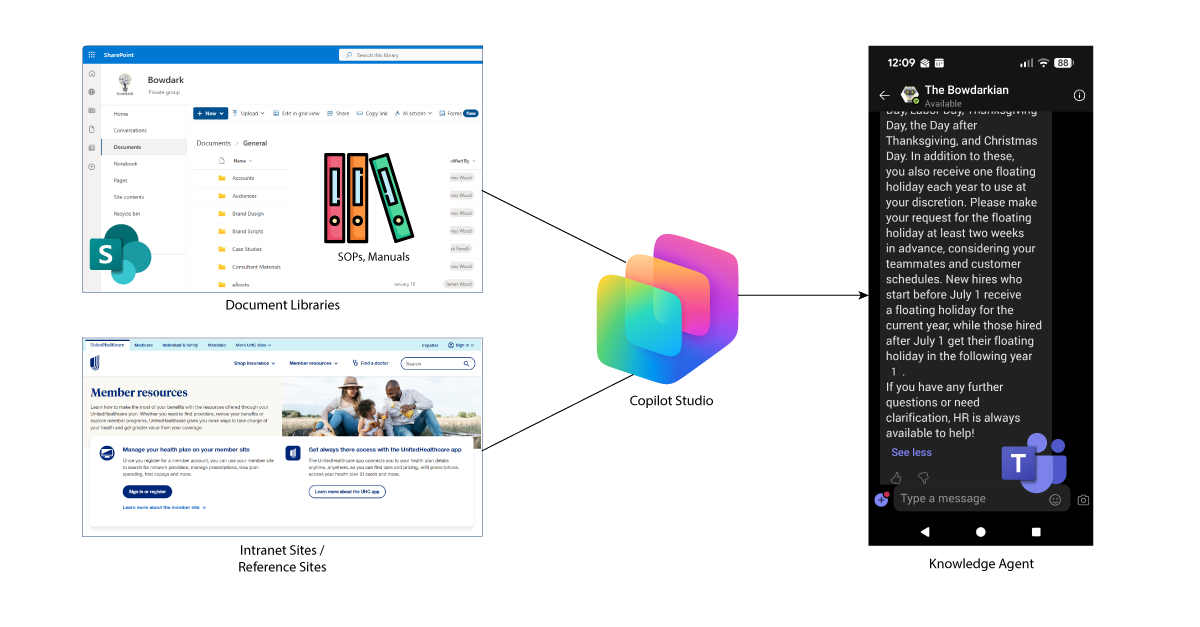To put these concepts into perspective, consider the agent shown in Figure 4 below. This real-world agent is something we developed internally at Bowdark to help our consultants get answers to a wide array of operational and policy-related questions. It taps into documented playbooks, onboarding guides, benefits documentation, internal standards, and system procedures to provide fast, consistent answers without requiring someone to track down the “right person” every time.