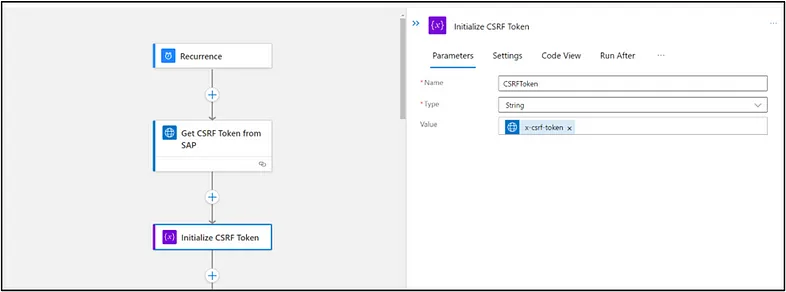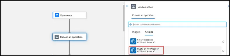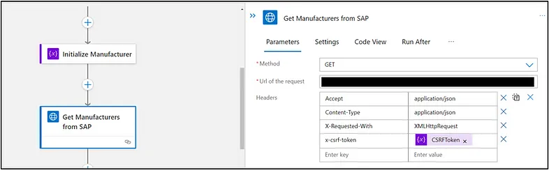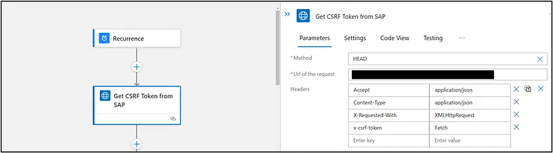 Now that we have our trigger, we will then create an action that sends a request out to SAP via HTTP with Azure AD to fetch a CSRF token from SAP as shown below.