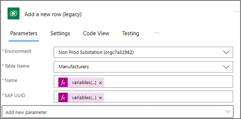 When we are creating new records in Dataverse, we will use the Add a new row (legacy) action and assign the variables we want stored to the table. Remember, the variables would be stored in the variable name that was set earlier in the flow.