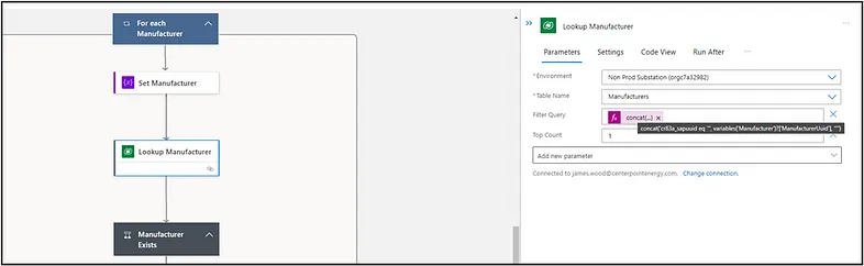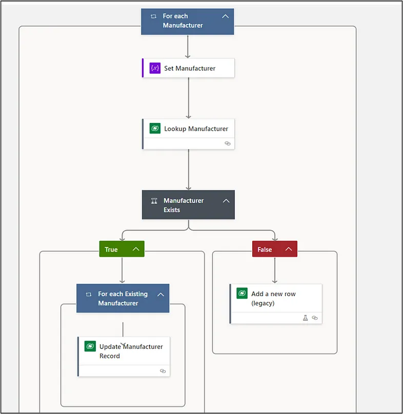 For each record returned by our loop, we will look up whether it already exists in Dataverse. As this program runs nightly, we don’t want duplicated records appearing in our table. We avoid this by creating a condition control for the ‘Manufacturer Exists’ action that will update Dataverse when the records are found or create new records when they do not exist in Dataverse yet.