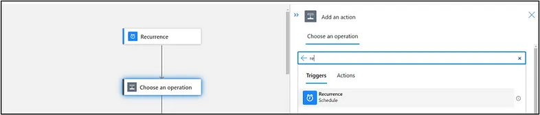 Every Logic App needs a trigger to start the flow and for this example, we will be using a simple recurrence trigger. By typing recurrence into the search bar on the side panel, we can see the recurrence trigger available for selection. Enter in your desired schedule whether that be daily, weekly etc.