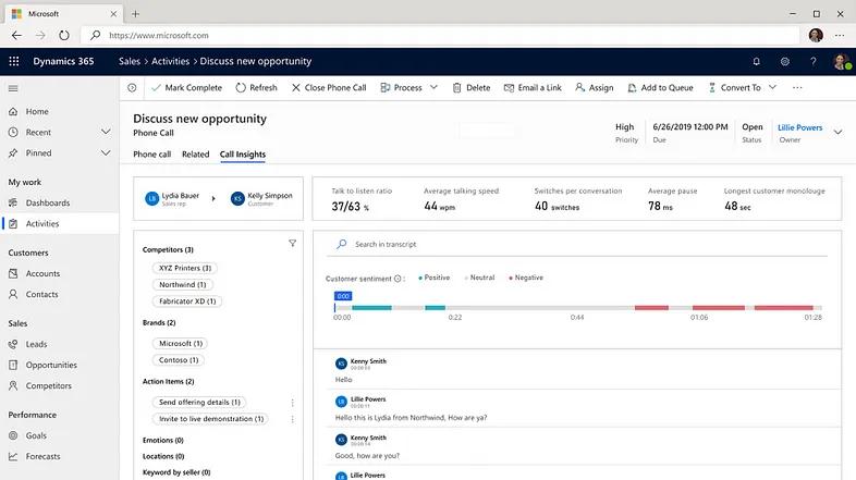 The “intelligence” part of conversational intelligence has to do with the way that Microsoft is able to analyze these conversations and use text/sentiment analysis to draw useful insights from them. You can see these insights on display in Figure 8 below on the Call Insights tab. Here, you can see how the system analyzed a phone call and captured quite a bit of useful information: