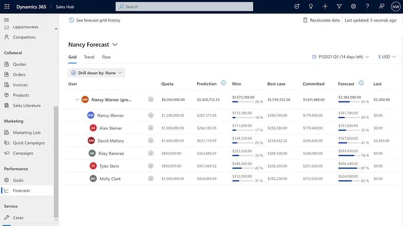 These features allow you to configure sales goals and forecast potential bookings at different levels of granularity. Once again, Microsoft uses ML to analyze opportunities and offer predictions on sales. As you can see in Figure 5, you can analyze the forecast from several different angles and even review historical trends.