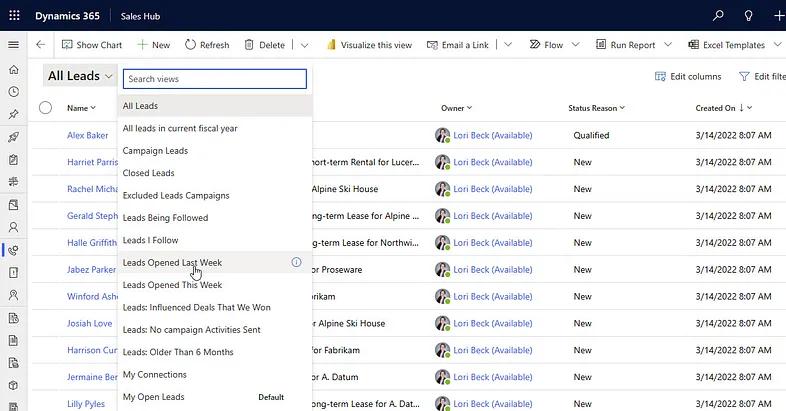 Sales team members also have the option of working off of views (or worklists) like the one shown in Figure 2 below. You can think of views as canned queries that users can use to search/filter through records. For example, as you can see in Figure 2, there are quite a few views provided to allow users to search for leads. By default, the system would just show a user their open personal leads, but they can always zoom out by selecting other views such as All Leads. If desired, users can create their own custom views that sort/filter the data as needed.