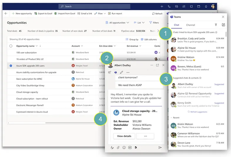These features provide sales team members with insights about various sales signals, recommendations on follow-on sales activities, and so forth. Microsoft strikes a nice balance here by allowing you to configure “sequences” of activities based on your company’s sales playbook. From there, the system uses AI/ML-driven insights to surface recommendations, offer predictive scores, and so forth. As you can see in Figure 4, these insights/recommendations are presented as cards which contain actions to allow sales team members to quickly respond to notifications.