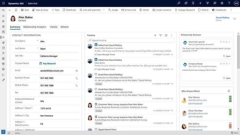 Since Microsoft owns LinkedIn, D365 offers excellent integration with the LinkedIn Sales Navigator. There’s also great support for integration with 3rd-party tools such as ZoomInfo and HubSpot. Figure 9 illustrates how sales team members can access the LinkedIn Sales Navigator tool within D365 Sales. Under the Relationship Assistant panel on the right, the Sales Navigator will offer various insights that can be added to the timeline or processed directly within LinkedIn.