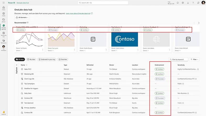 By applying product thinking to domain-oriented data, we’re able to transform many of those “throw-away” data assets into reusable data products that are both trustworthy and user-friendly to consumers. Within Fabric, product owners can promote these data products for widespread use across the organization. Using the OneLake Data Hub view shown in Figure 3 below, users can filter by domain and search for endorsed data products with ease. This takes a lot of the guesswork out of scanning through data artifacts to find the right one(s) to leverage for new projects.
