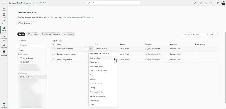 As we observed in the previous section, consumers can easily search for endorsed data products within the Fabric UX. Then, they can right-click on an object and jump right into their preferred tool(s) to start drawing insights from that data (see Figure 5).