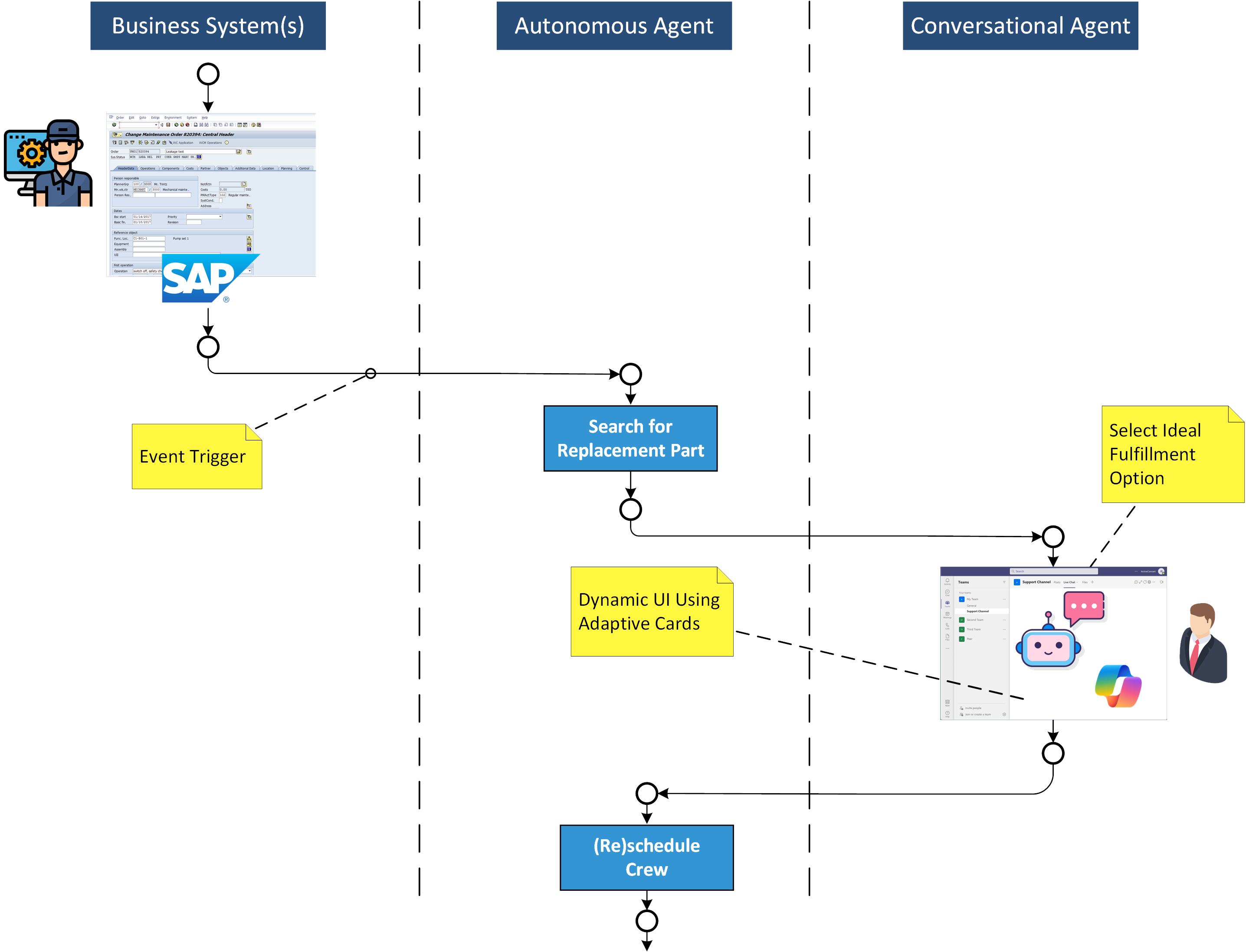 In this reimagined, agentic flow, however, that responsibility shifts. An autonomous agent now monitors work order statuses in real time and is capable of reasoning through many of the necessary remediation steps on its own. If a part is missing, the agent can search for available inventory, check lead times, and even prepare a purchase request if needed. And when human input is required—say, to approve an expedited order or choose between sourcing options—the agent surfaces a prompt directly within Microsoft Teams, reducing the cognitive load and context switching. Once the supervisor provides their input, the agent picks up the baton again and continues executing in the background, allowing supervisors to stay focused on managing operations instead of chasing down data across disconnected systems.