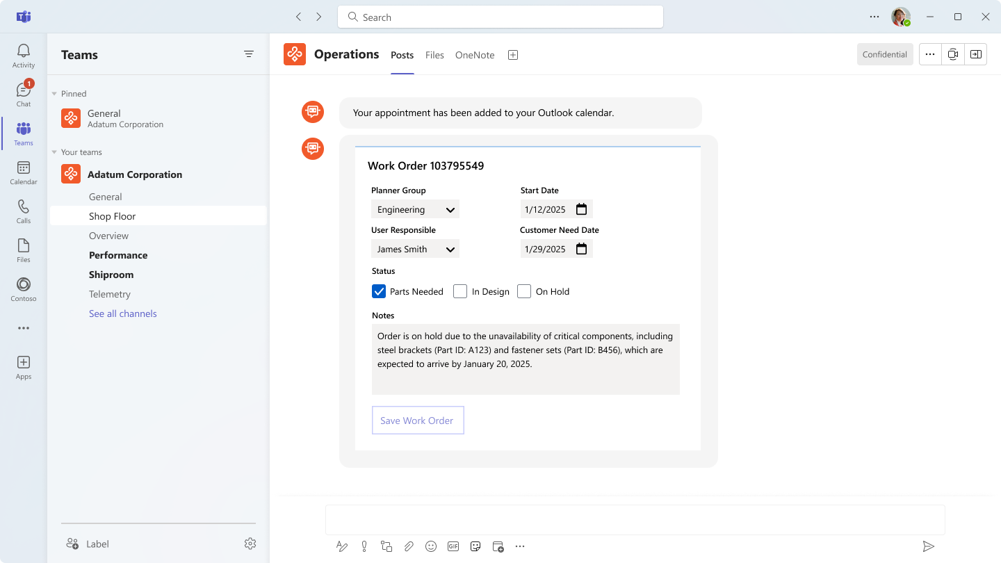 Figure 5 illustrates how all this can come together in a bot experience inside Teams. Here, you can see that the bot has access to the technician's calendar and can perform various tasks automagically where needed. In the bottom section, you can also see where we've embedded an adaptive card that contains a work order form. You can think of these adaptive cards as being like mini-apps that make it easy for various stakeholders to jump in and respond to an issue without having to drop what they're doing and go log onto various ERP or shop floor systems.