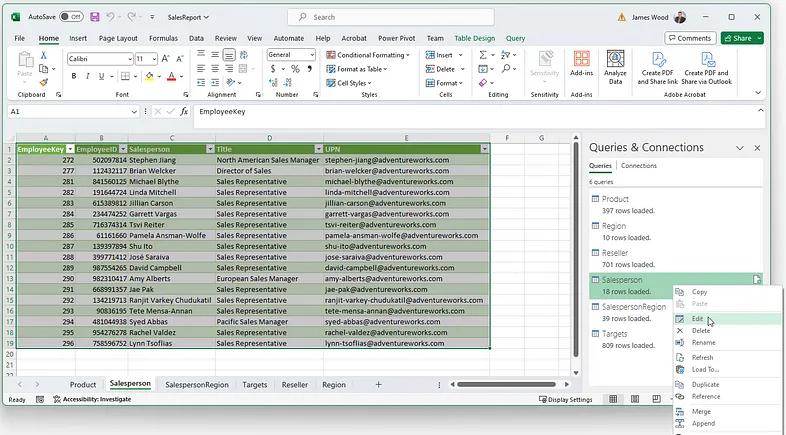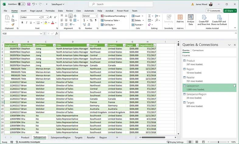 The end result is shown in Figure 7 below. Here, we’ve taken the raw salesperson data and brought in information about their assigned territory and targets. We’ve also removed unneeded columns, massaged some fields (e.g. salesperson name), and applied some formatting.