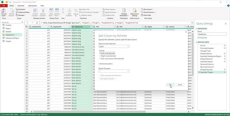 The next operation we’ll perform is to split the Salesperson name field into discrete first and last name values. For this, we’ll right-click on the Salesperson column and choose Split Column → By Delimitter…. Then, in the popup dialog box shown in Figure 6, we’ll select a space as our delimitter and split the columns.