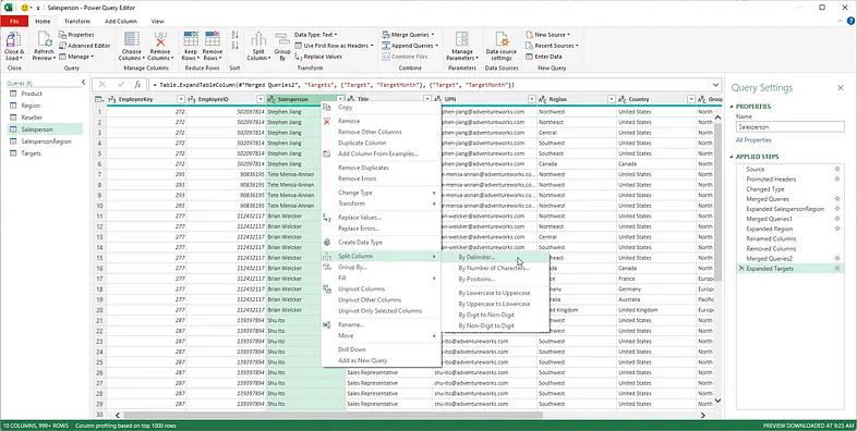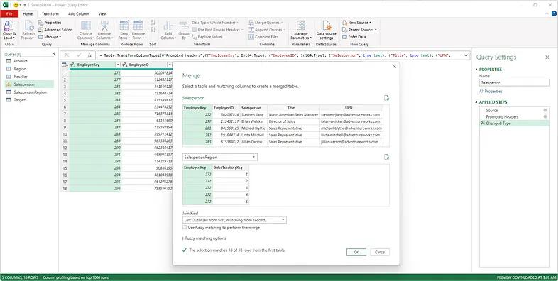 To put these features to work, we’ll start by performing a merge query between the Salesperson and SalespersonRegion datasets, matching up on EmployeeKey. Using a Left Outer Join, we can easily pull in region/territory assignments for sales reps so that we have it all right there in front of us.