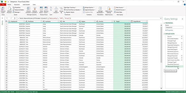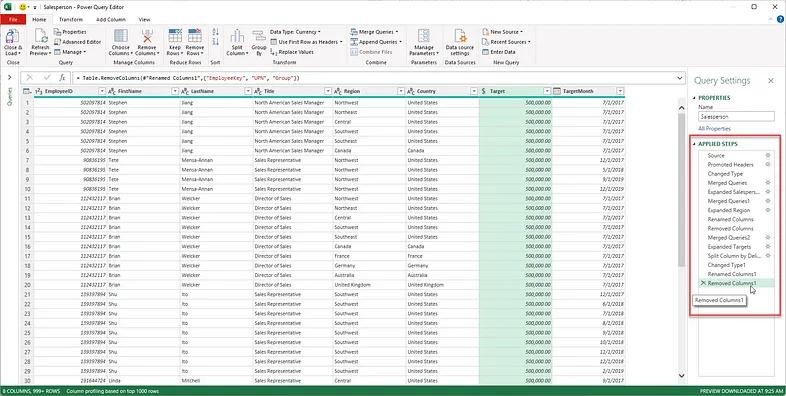 However, the real reason for why you would want to do this in Power Query is right there in the query editor. As you can see in Figure 9 below, each change we make to datasets — no matter how large or small — is recorded as an applied step in the Power Query macro recorder that’s responsible for building our M code. This has some huge implications: